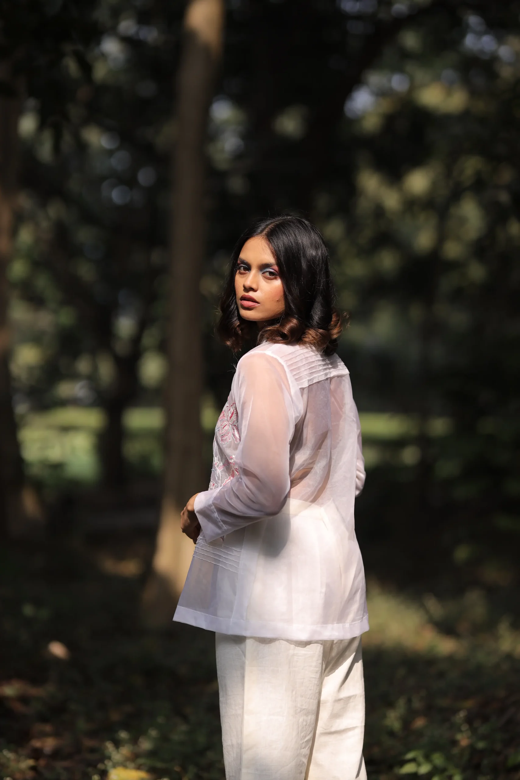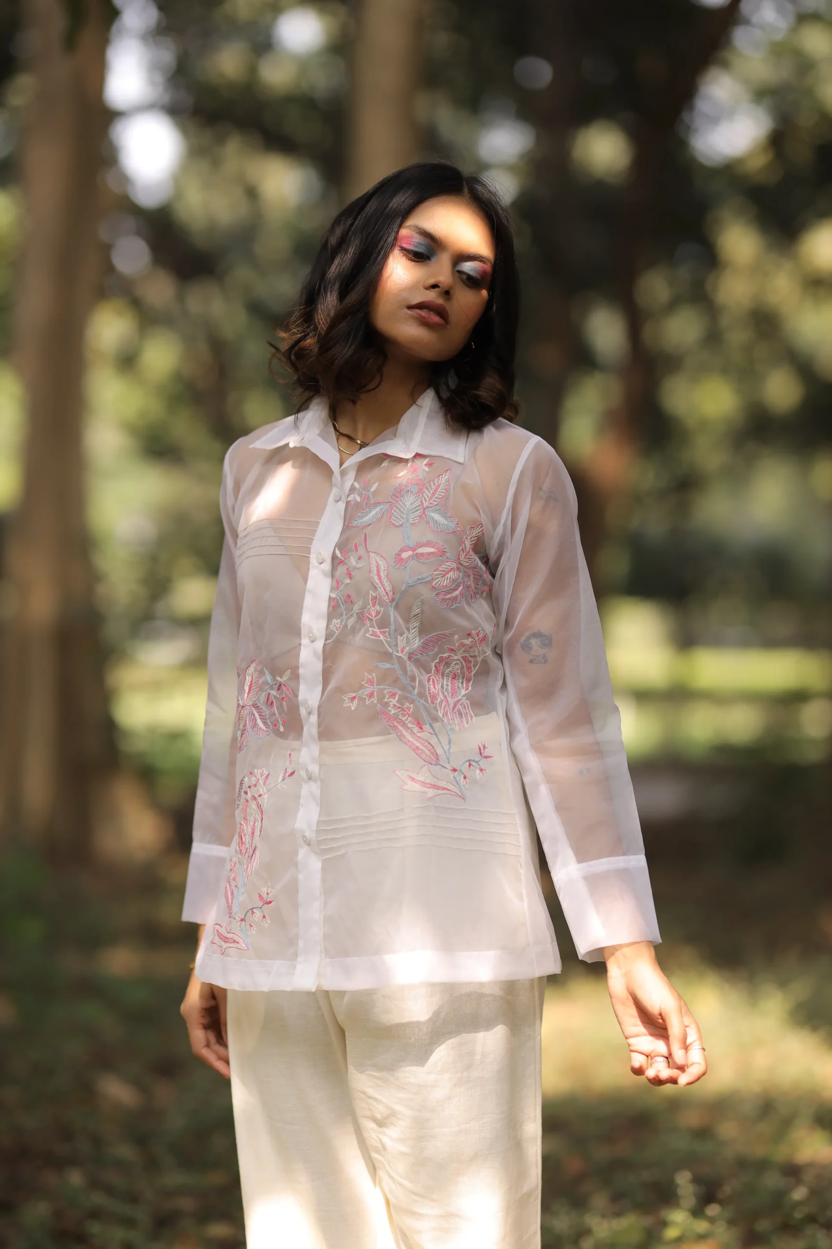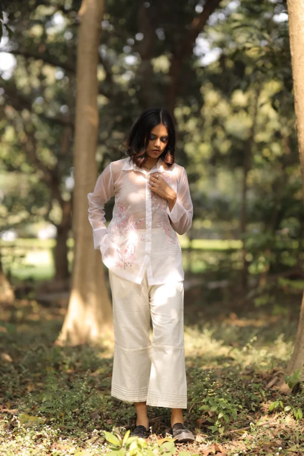 A quiet celebration of craft and comfort. The Fern Set pairs a sheer organza shirt, delicately embroidered with soft botanicals, with wide-legged cotton-linen pants.