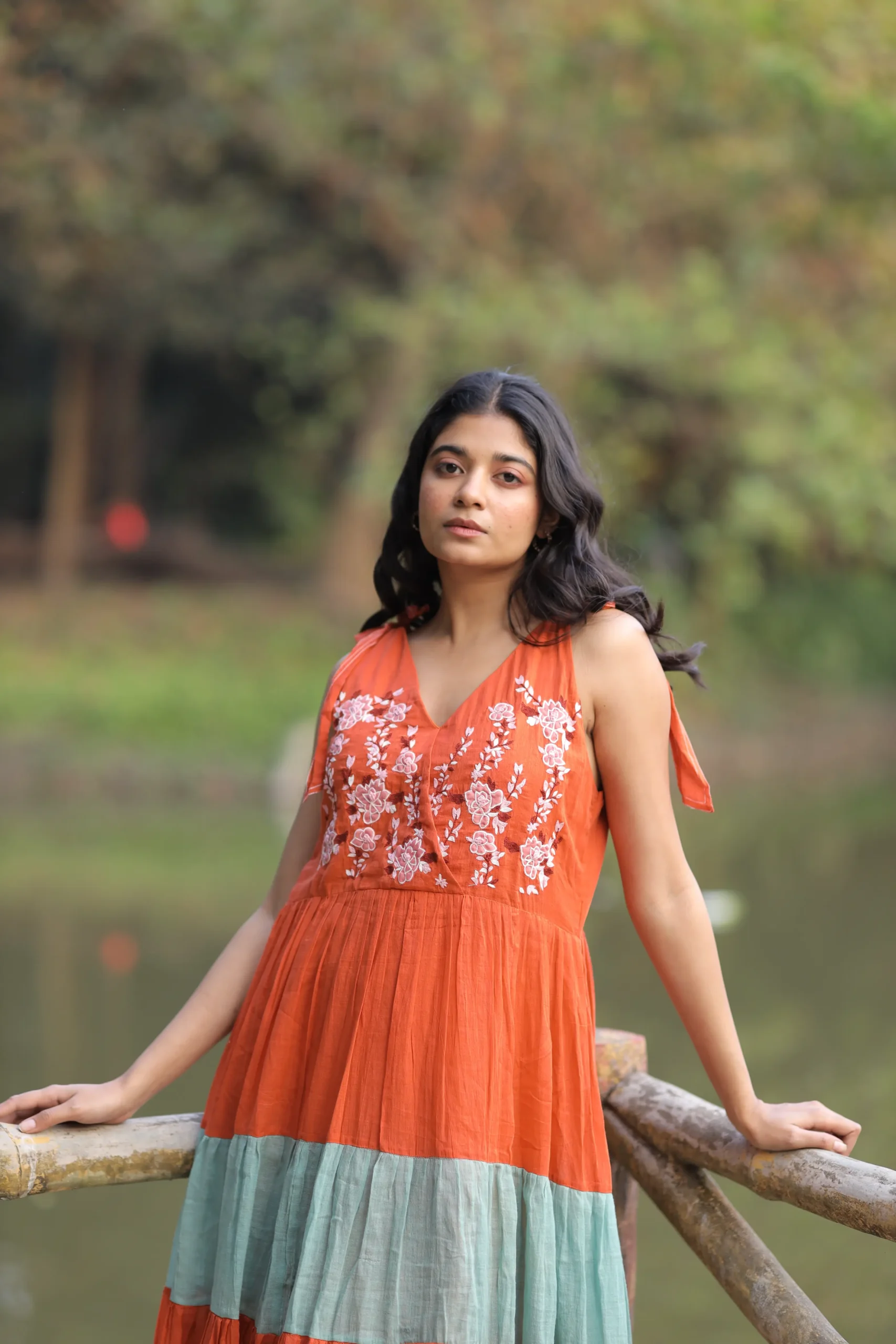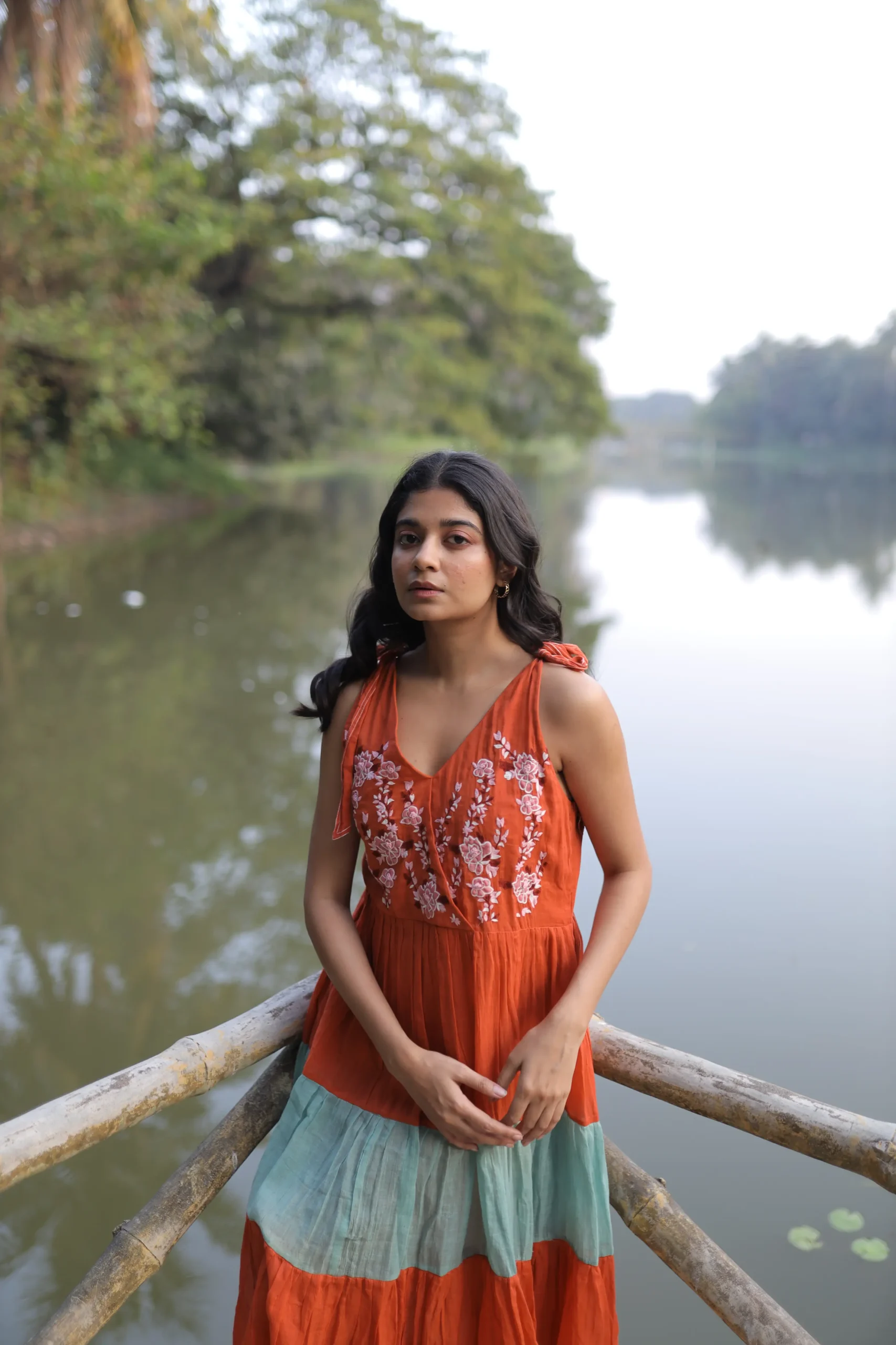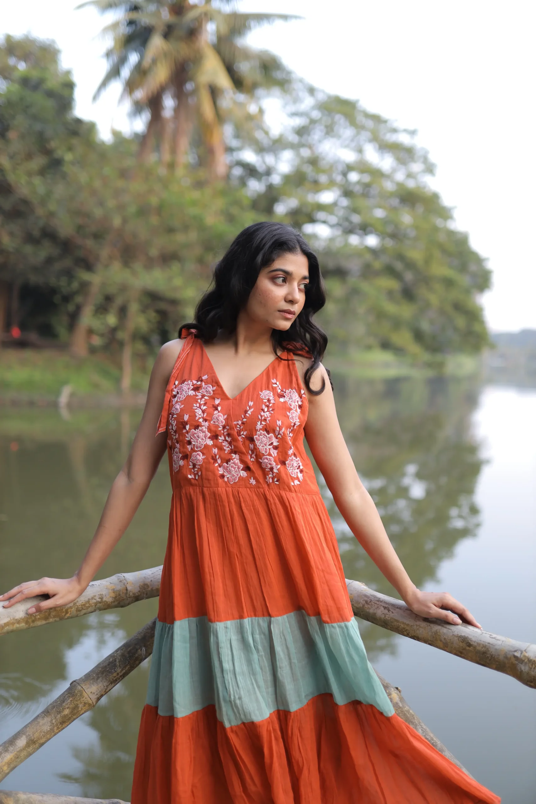 The floral hand embroidery created with organza applique is the highlight of the dress