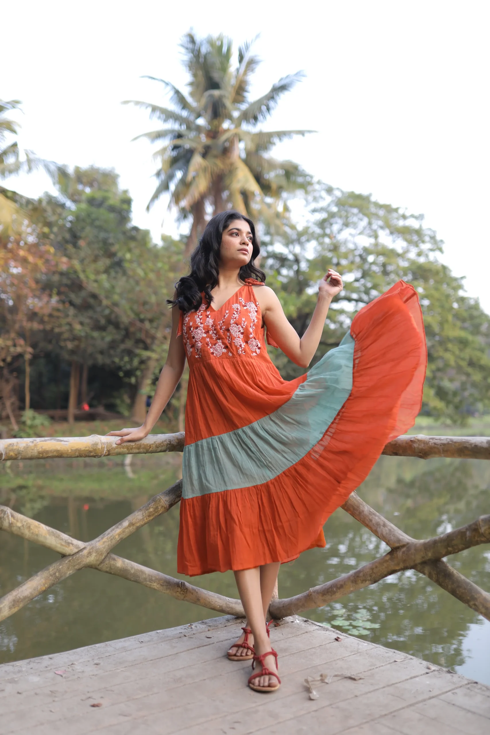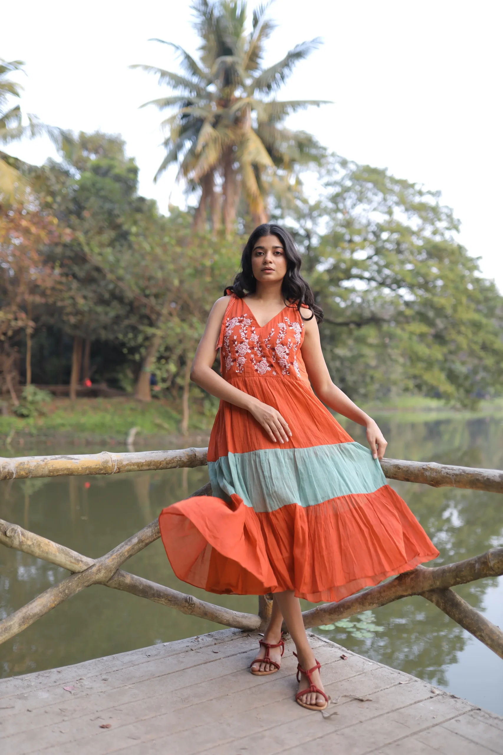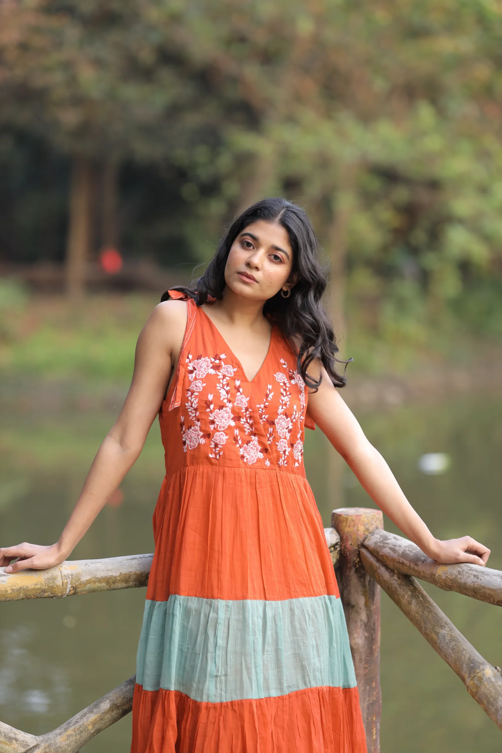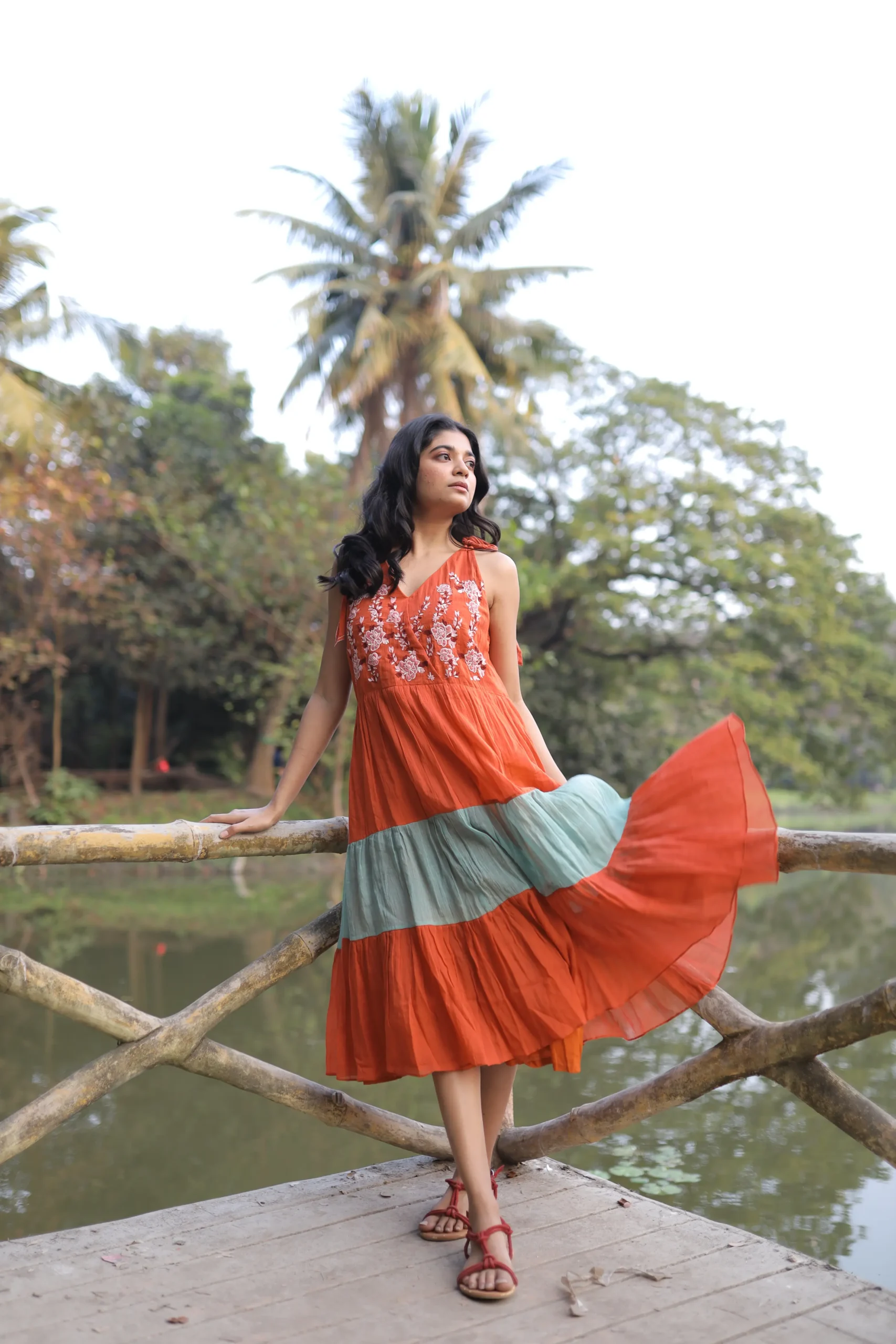 The floral hand embroidery created with organza applique is the highlight of the dress