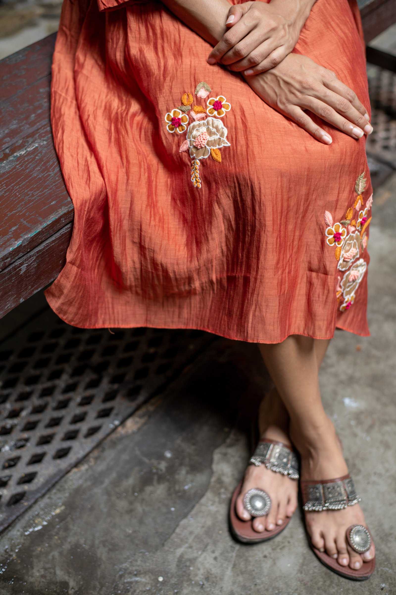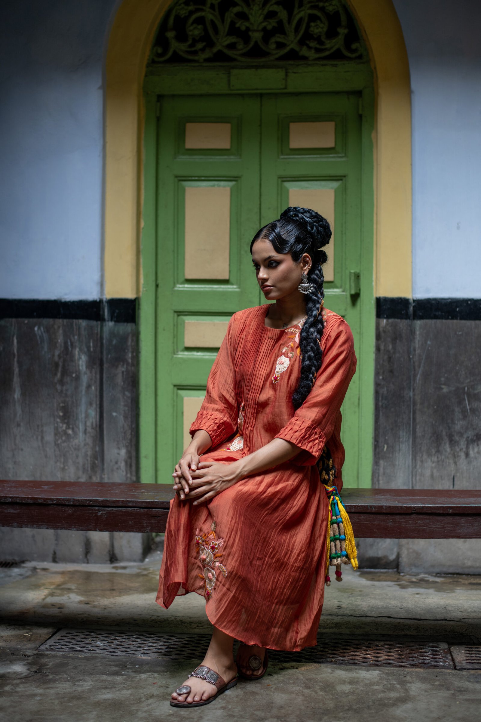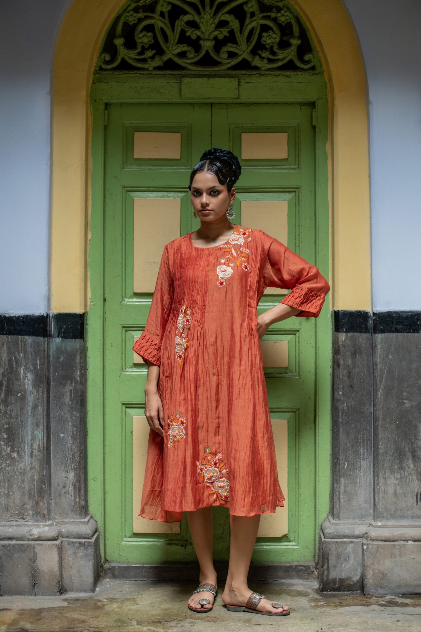 A rust orange shift dress, exuding earthy richness in textured cotton. The silhouette is relaxed yet elevated with pleated sleeve cuffs that echo architectural precision. Delicate hand embroidery unfurls like painted vines across the yoke and hem, rendered in warm ivory and coral threads. The dress, with its timeless flow and artisanal details, feels both grounded and radiant—like terracotta kissed by light.