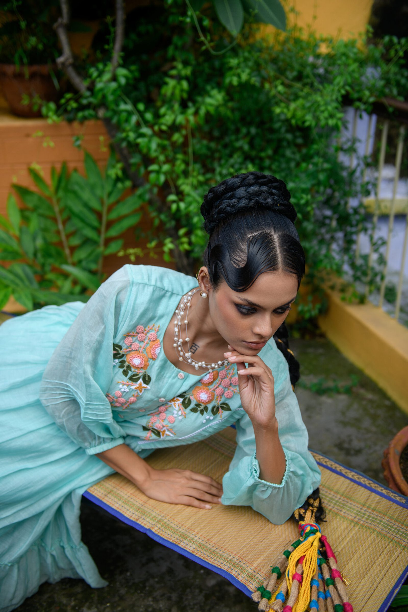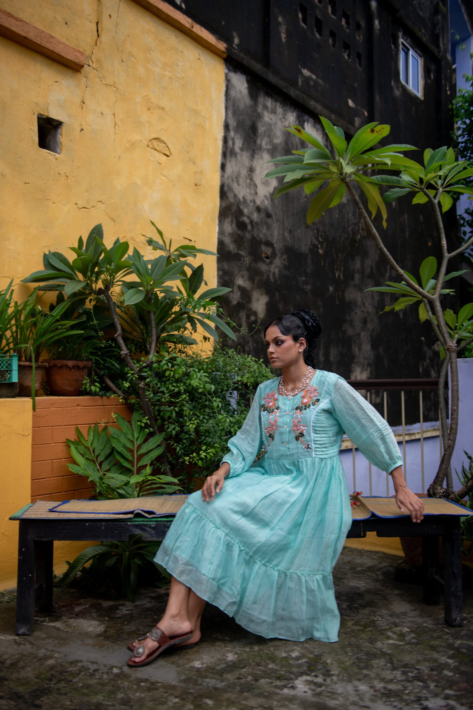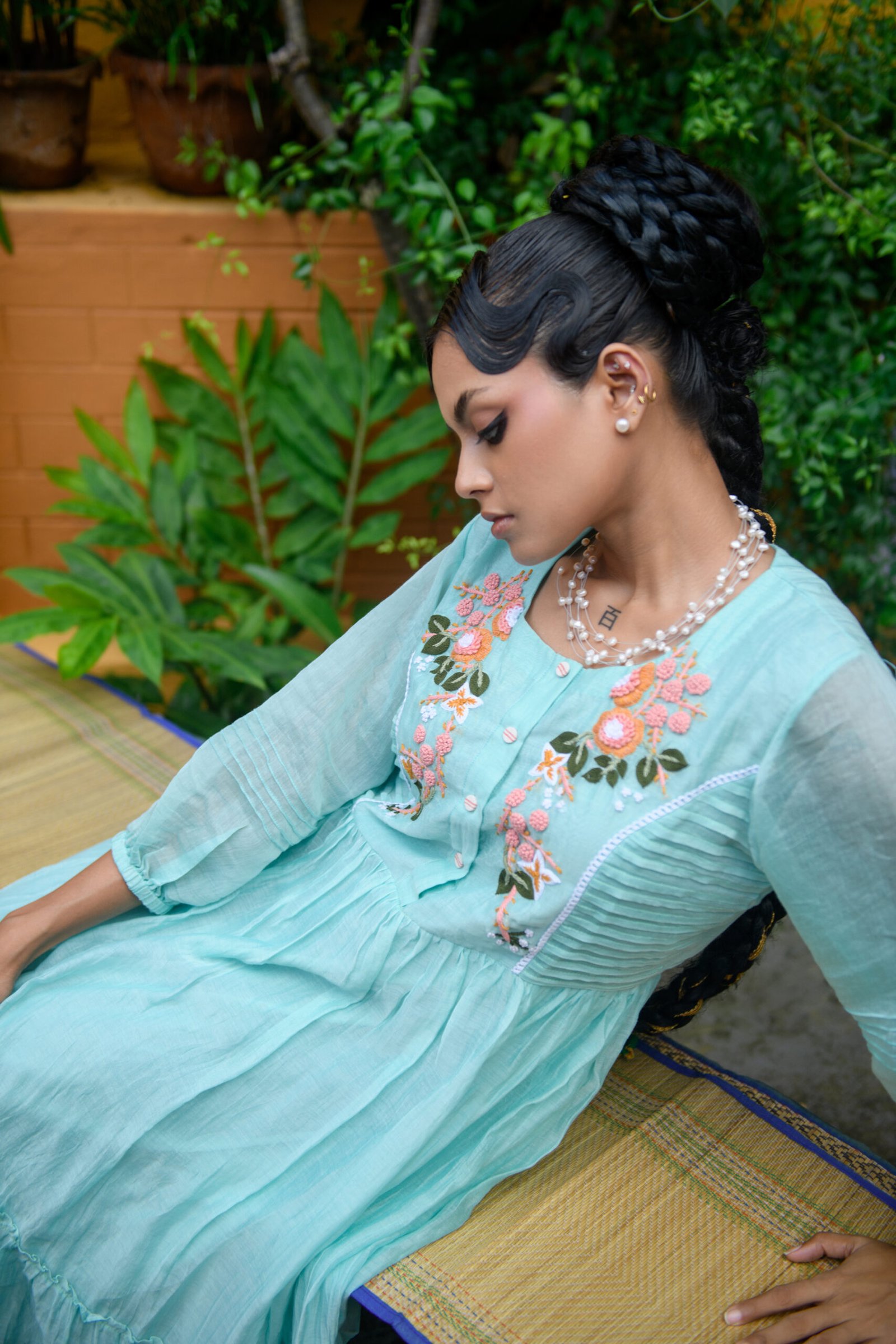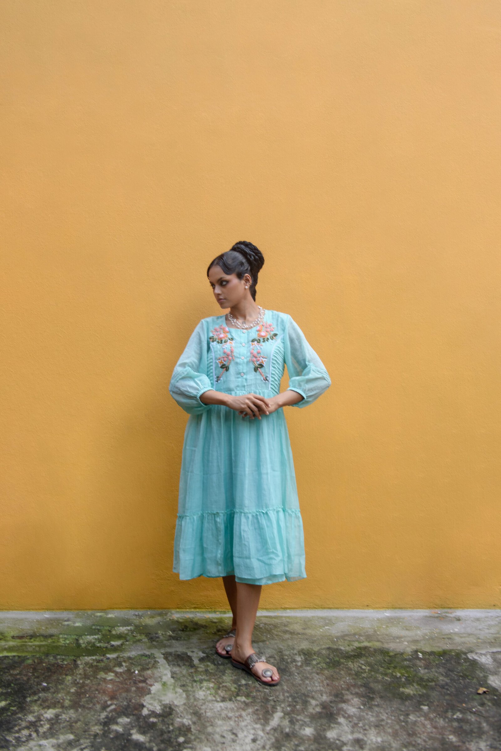This dress carries the calm of still waters. Gentle tiers flow into a relaxed A-line silhouette, while hand aari embroidery in coral blooms unfurls across the bodice. Knife pleats at the sides add quiet structure, and the puffed sleeves finish with subtle gathers that echo vintage romance