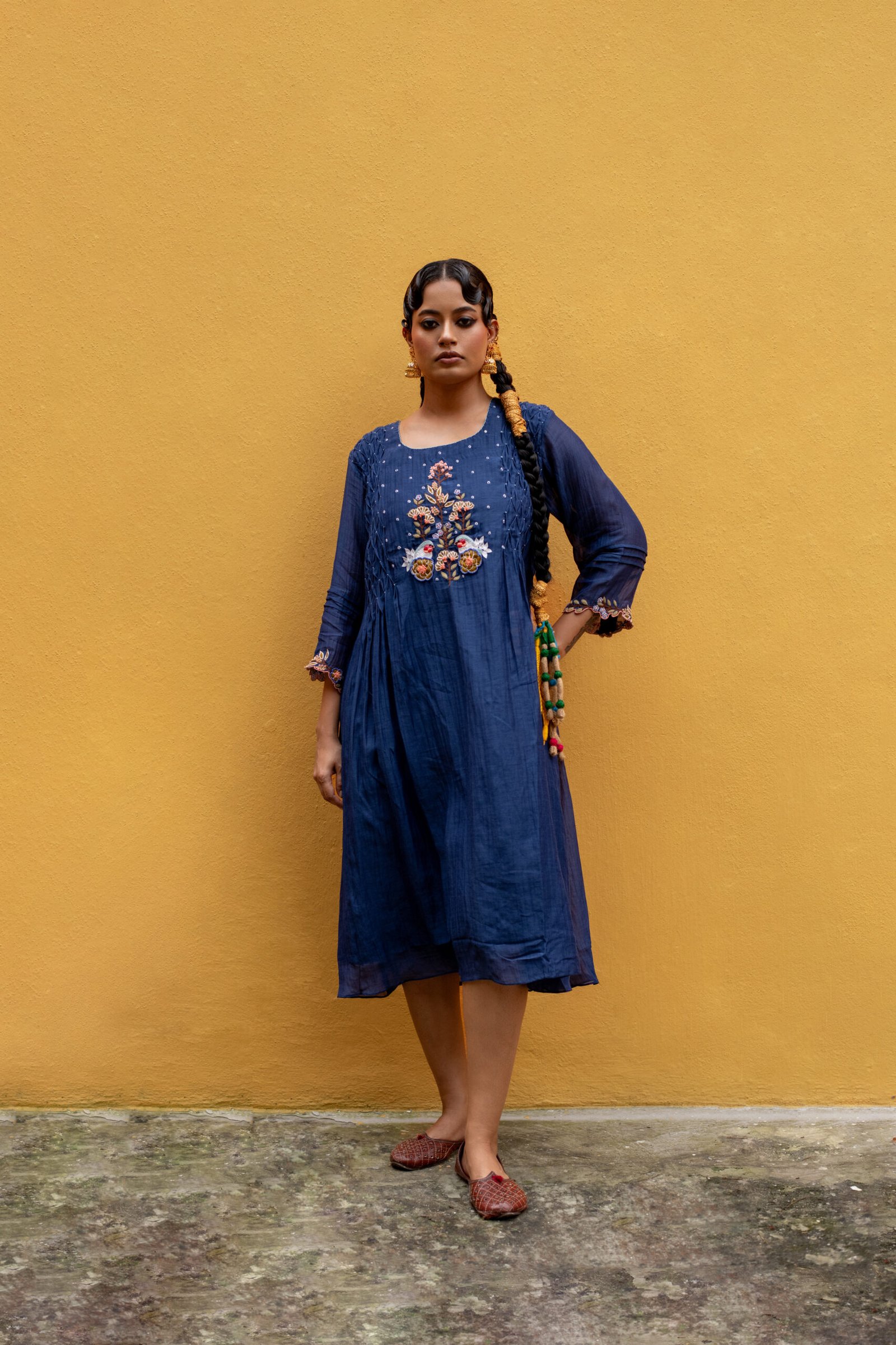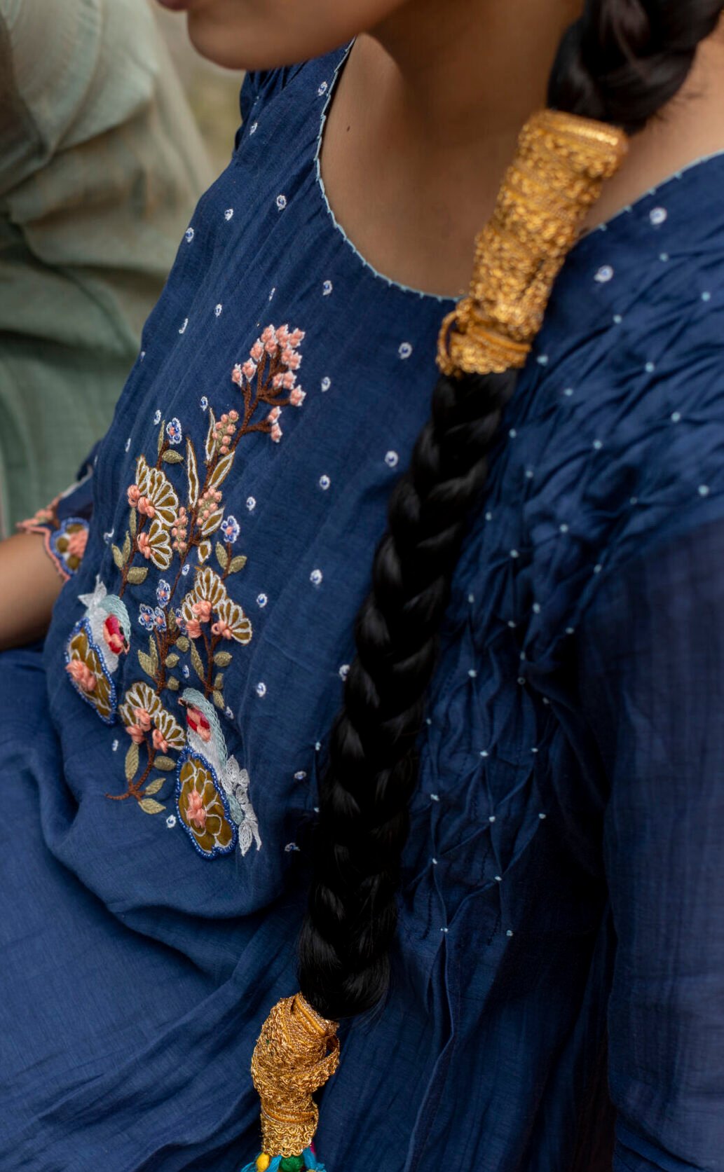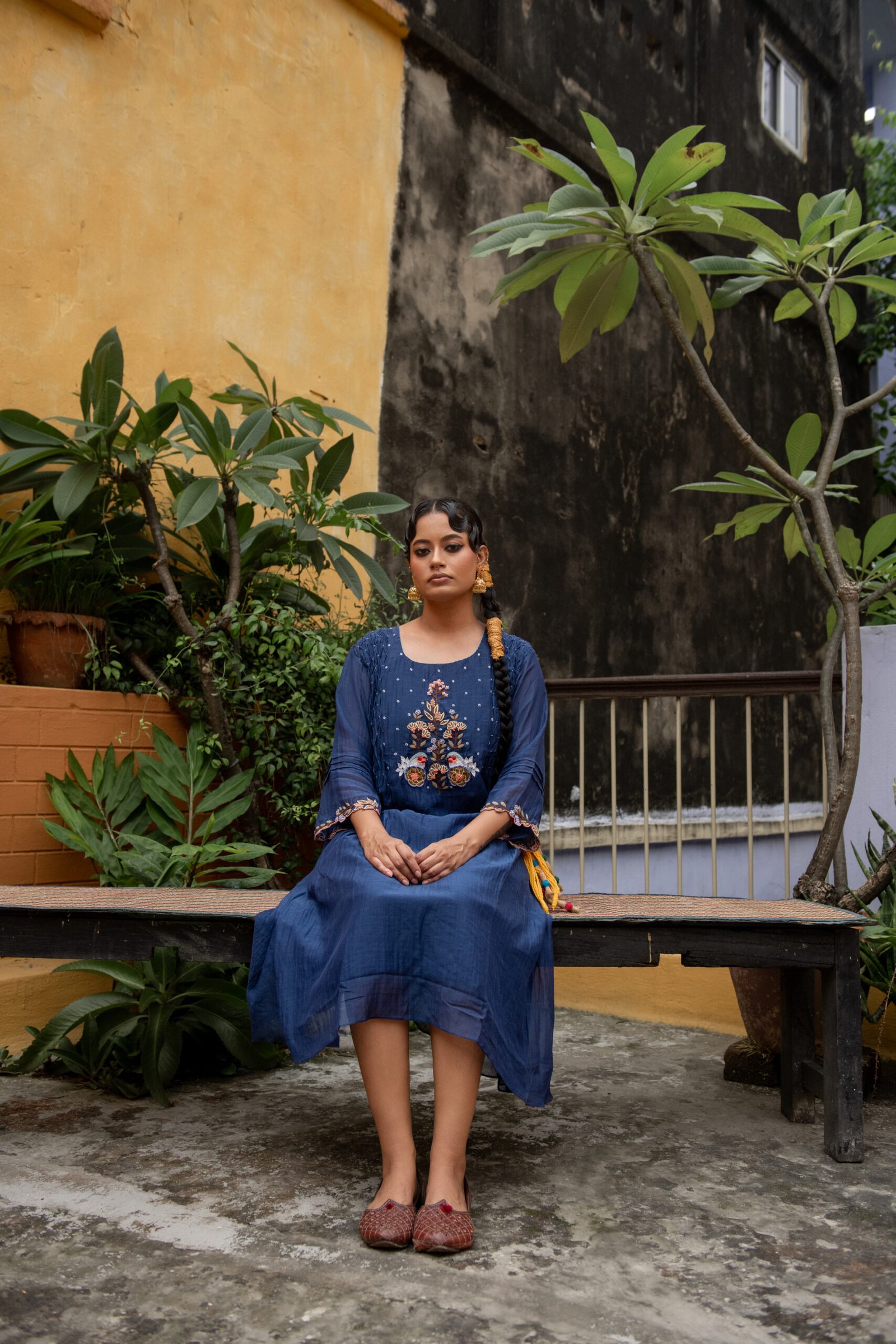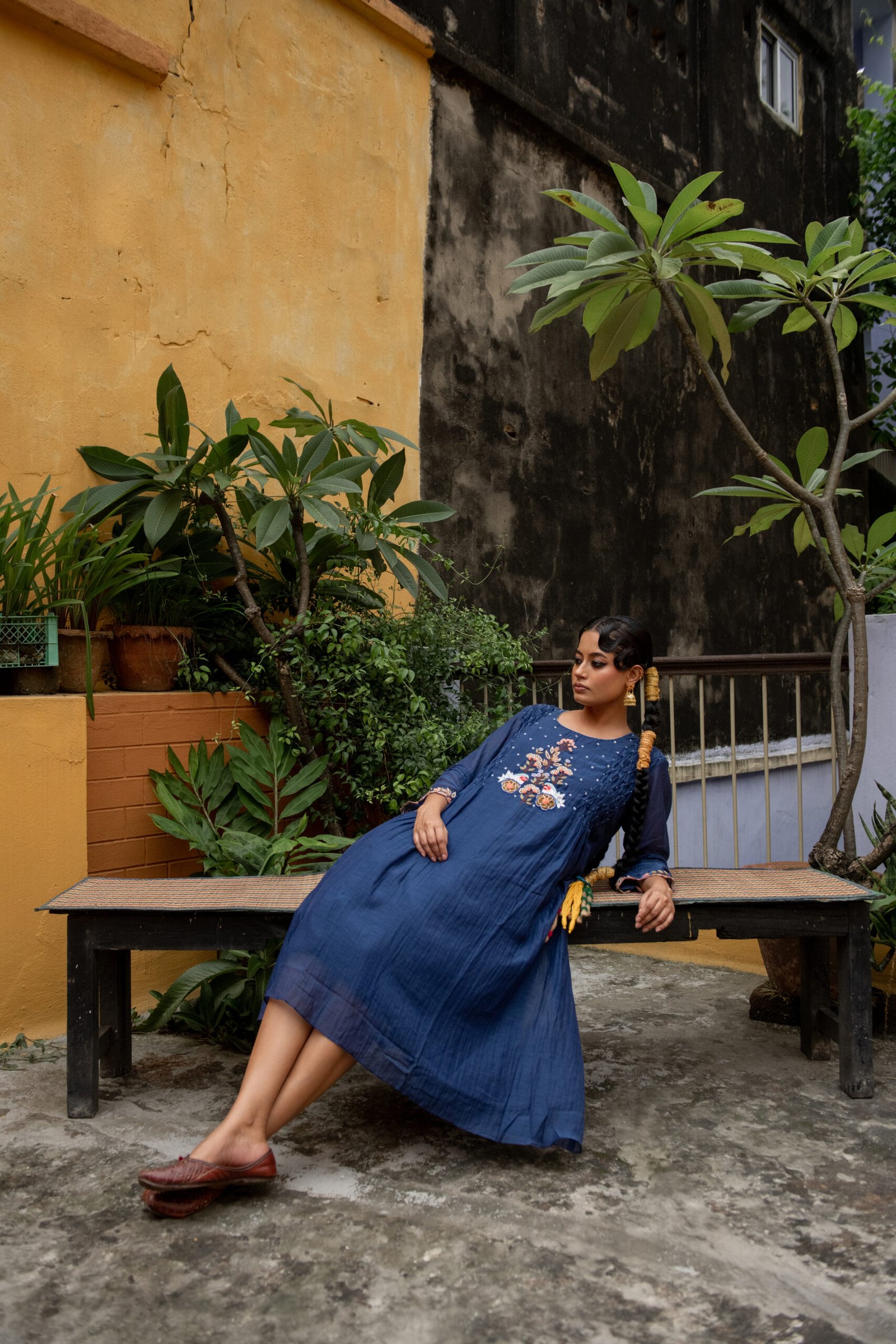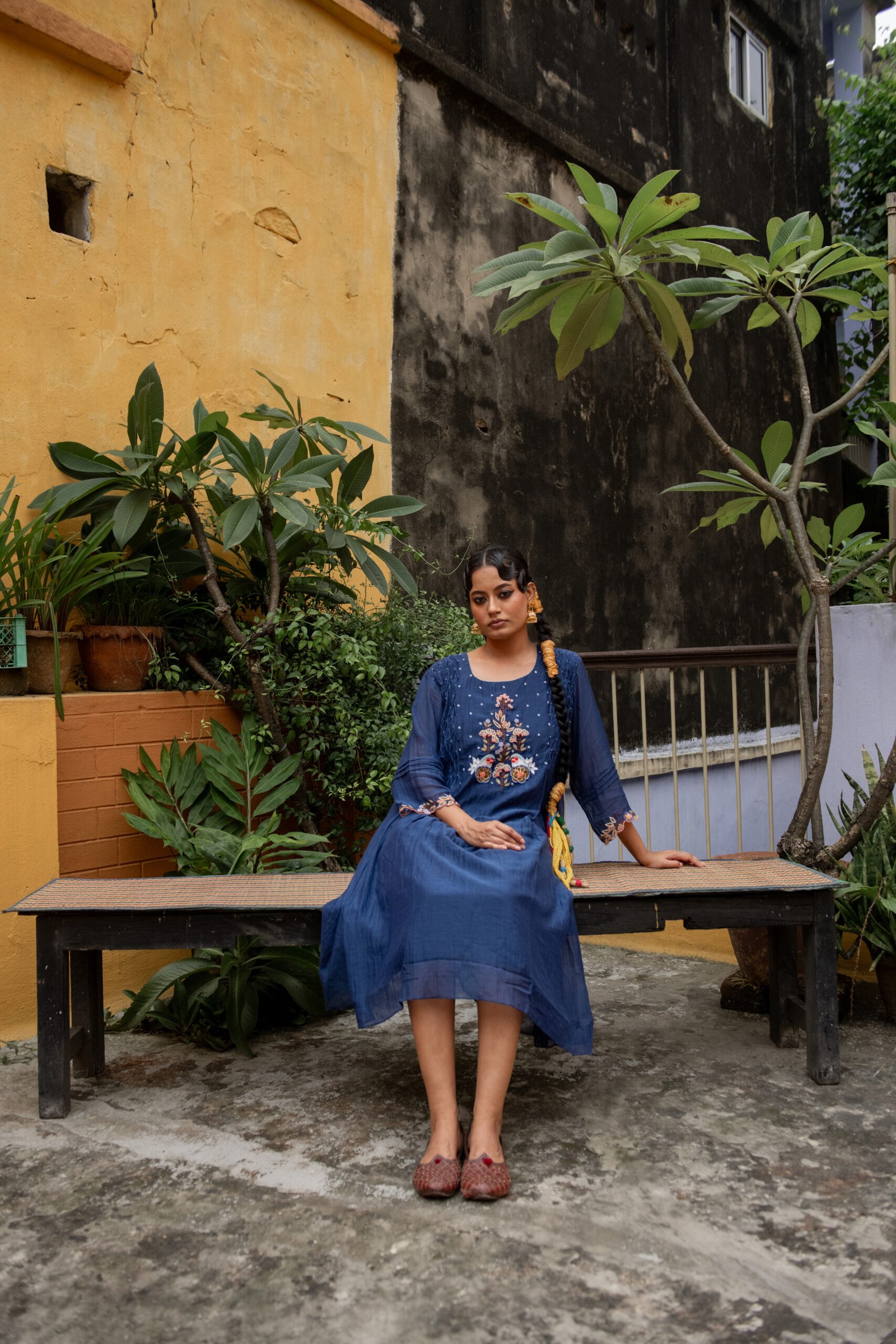Grounded in deep indigo, this dress carries a hand-embroidered floral motif blooming upward from the waist. Speckled hand-done French knots mimic constellations across the yoke, while flared sleeves are finished with embroidered trims. A poetic balance of tradition and timeless elegance, softened by the fluid fall of chanderi