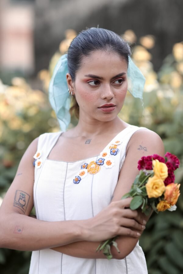 Crafted in soft handloom cotton, the May dress features a paneled silhouette with a square neckline and bright floral embroidery near the shoulders — like garden blooms tucked close to the heart.