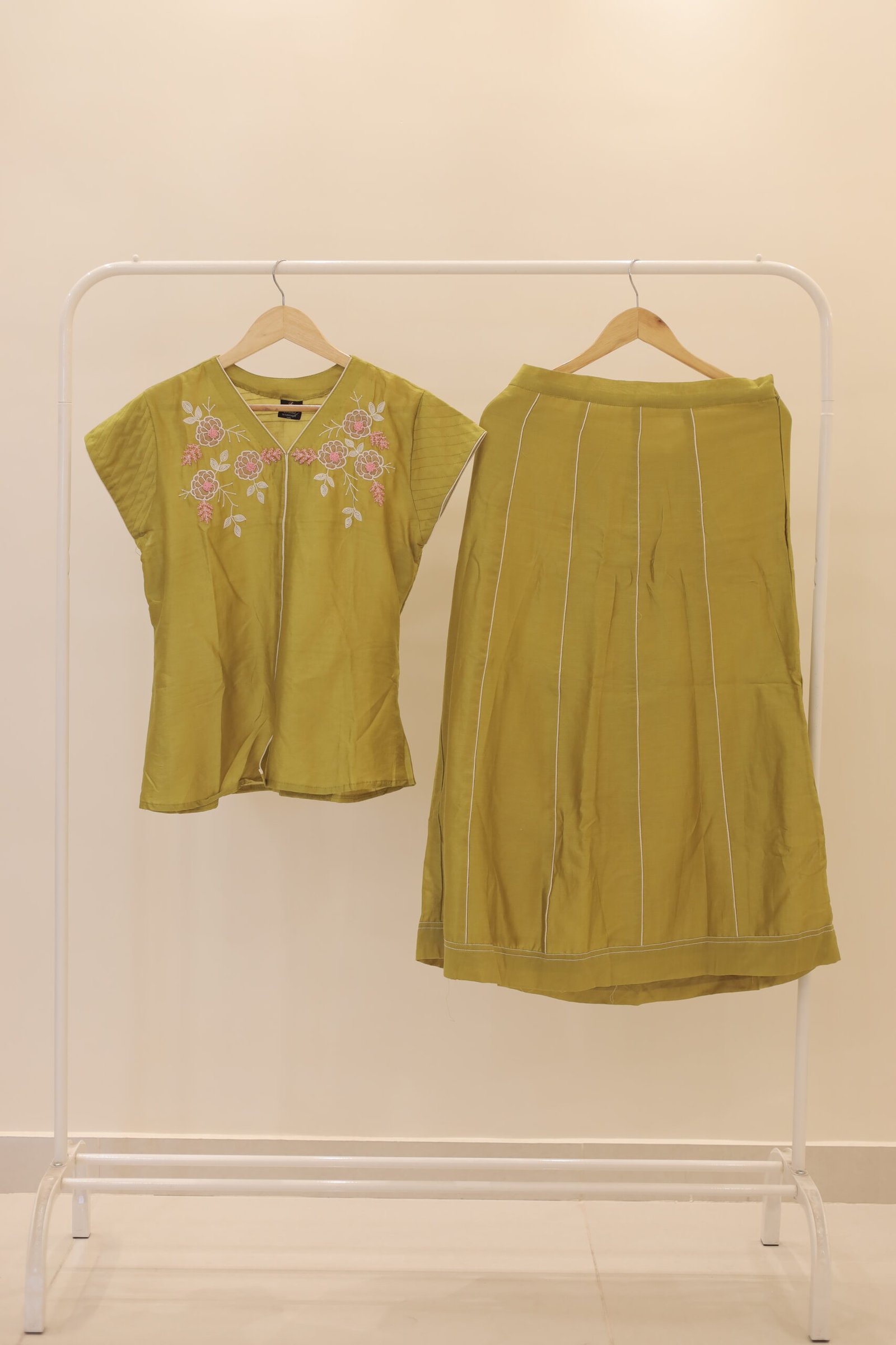 This two-piece co-ord set pairs a structured olive green blouse with cap sleeves and vertical panel detailing, with a complementing A-line skirt that features subtle vertical pinstripes. The top stands out with intricate floral embroidery in pastel shades around the neckline, adding a soft, handcrafted element to the otherwise minimalist set. The skirt maintains a simple silhouette, making it a versatile choice for both workwear and elevated casual looks