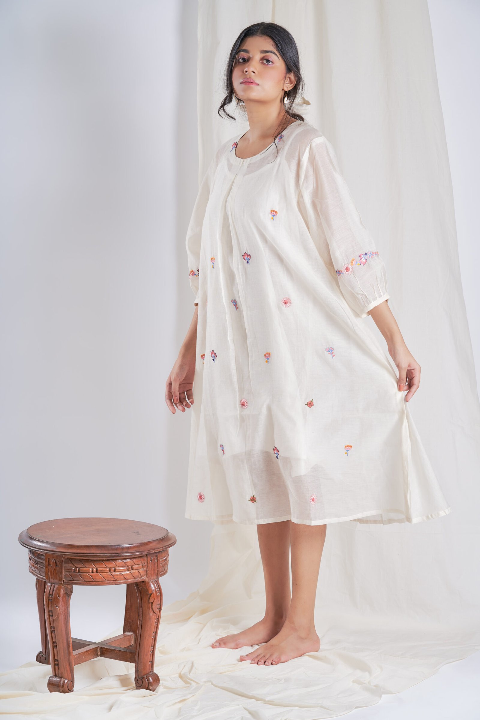 This airy, ivory-hued midi dress is adorned with delicate multicolor floral embroidery scattered playfully across its surface. The relaxed, voluminous silhouette flows freely, creating effortless grace, while subtle pleats at the front and gently gathered sleeves add quiet structure. Embroidered sleeve cuffs tie the look together, making it a charming piece perfect for slow mornings, creative days, or simply lounging in elegance