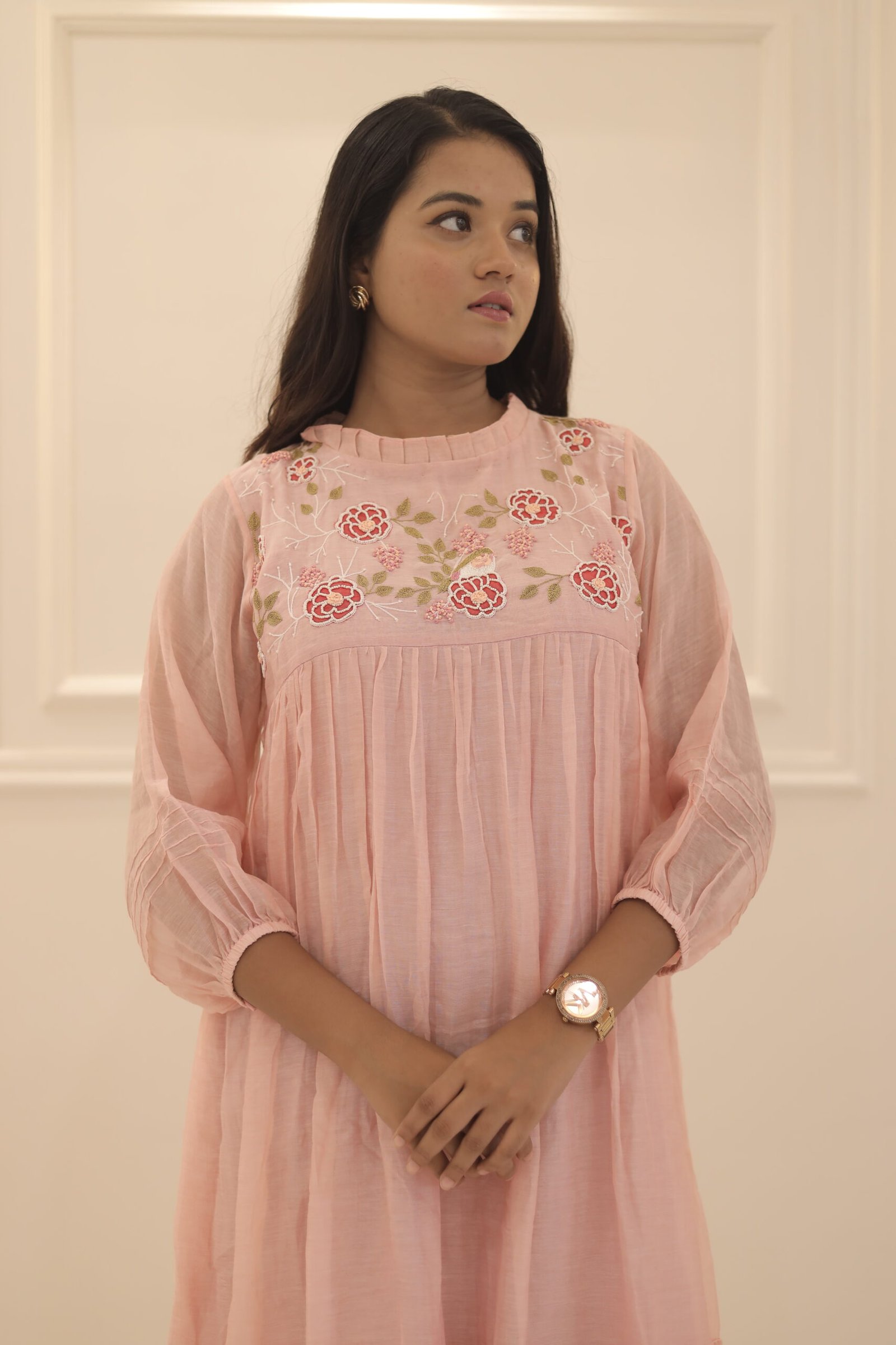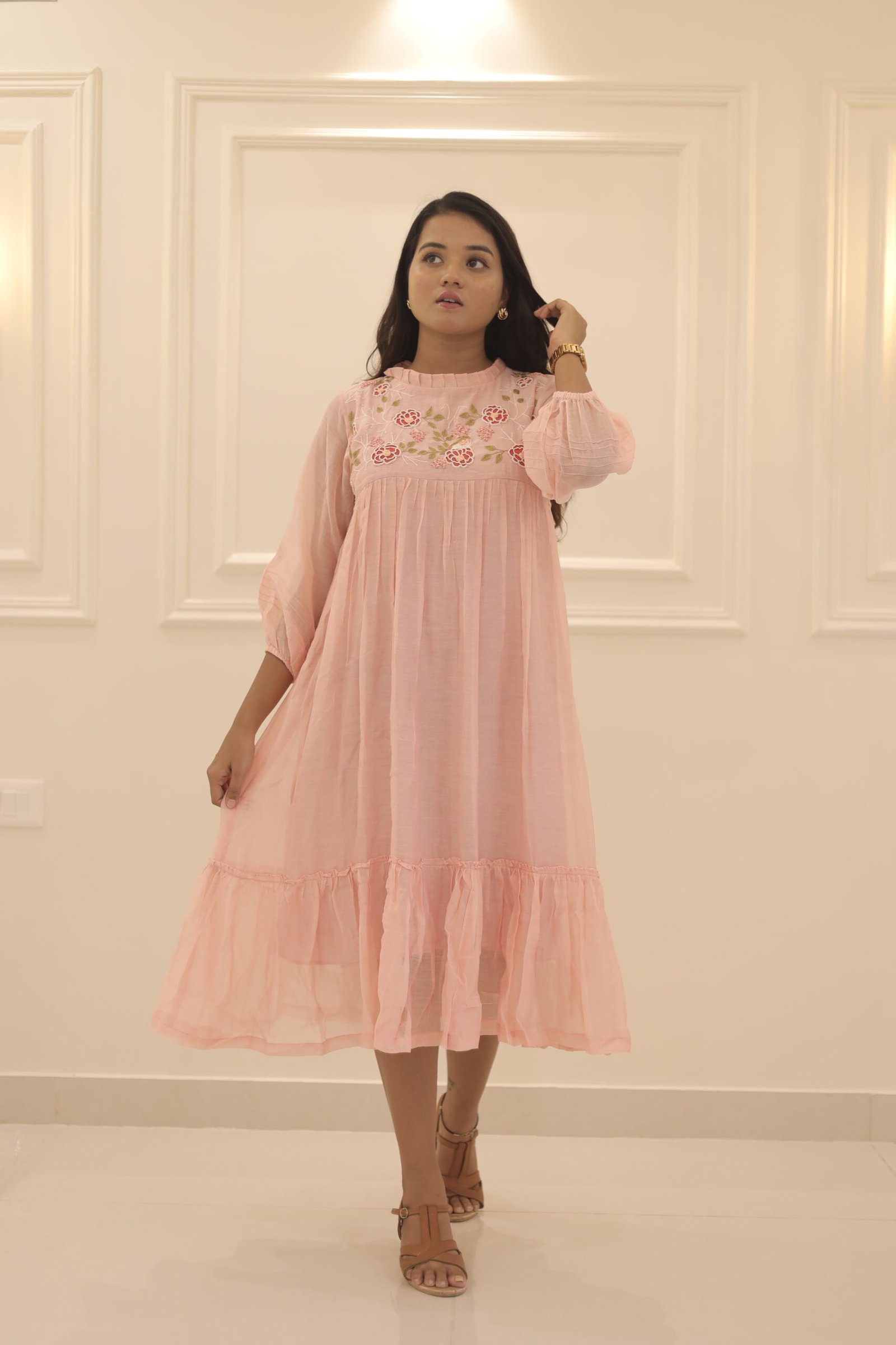 Step into subtle sophistication with this blush-toned midi dress. Featuring long puffed sleeves, floral yoke embroidery, and a comfortable flare, it’s made for moments that matter.