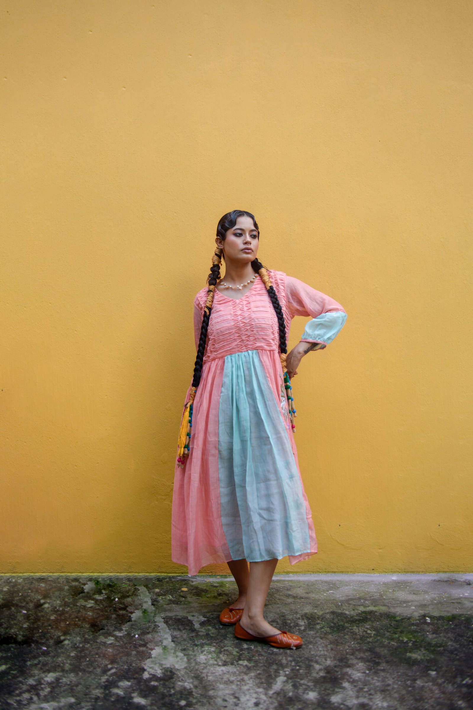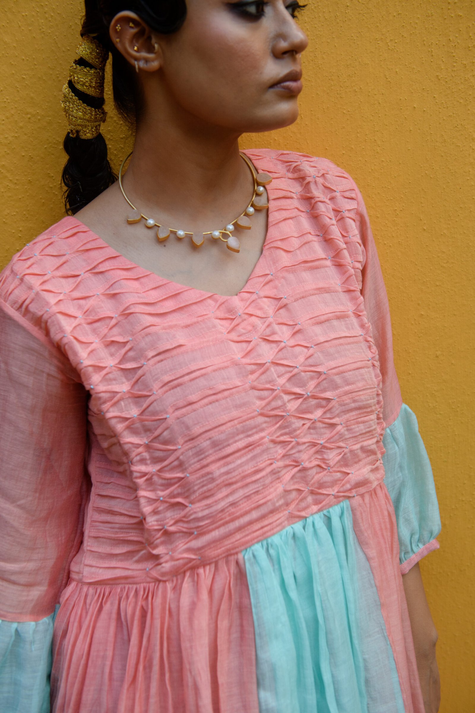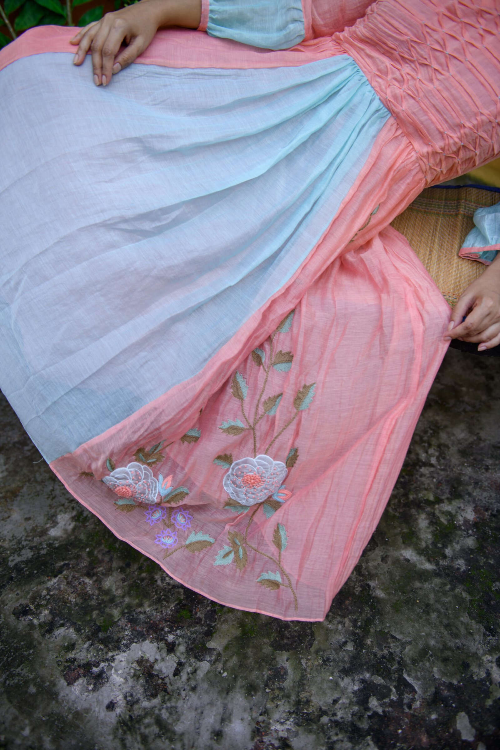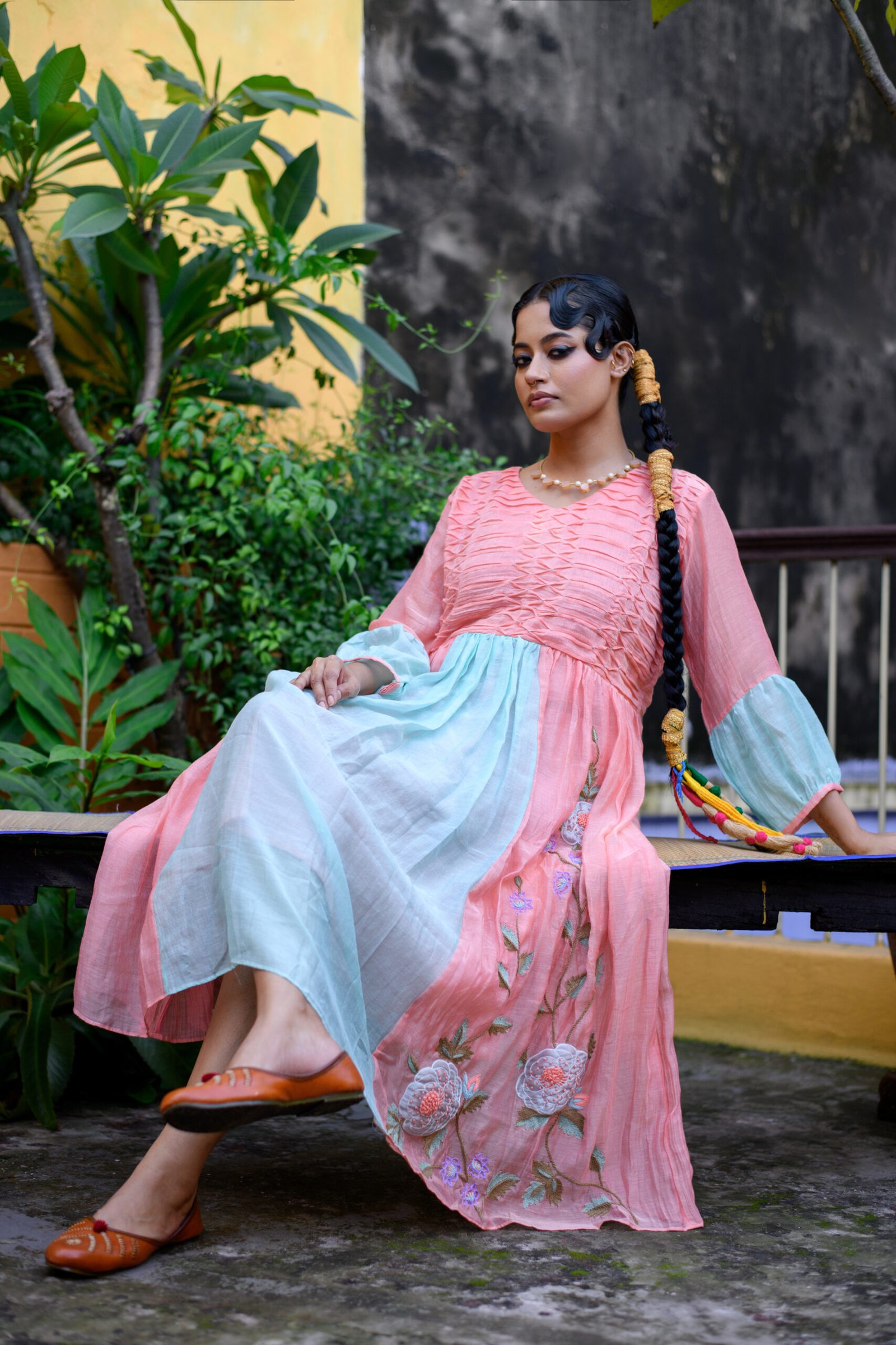 A dreamy panelled maxi dress crafted in handwoven chanderi, where soft peach and aqua hues cascade fluidly into each other. The bodice is delicately smocked with intricate pintucks, adding texture and dimension. Billowing sleeves, finished with contrast panels, frame the silhouette with lightness. The lower panels bloom with thread-embroidered florals in muted pastels, echoing the romance of a summer garden. A dress that sways between artisanal craftsmanship and ethereal elegance